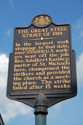 While the nationwide strike was defeated after several months, the worst aspect locally was the importation of thousands of poor black strikebreakers from the South, where the boll weevil had devastated cotton crops. Because of discriminatory practices, African Americans had little experience with unions and until the New Deal voted solidly Republican. For the immigrant strikers, public meetings were forbidden as was speaking to groups in foreign languages. Gatherings in the street were dispersed by force. Resistance to corporate repression in Braddock was centered at St. Michael’s Slovak Church (now Good Shepherd). Father Adalbert Kazinci allowed union meetings and testified on behalf of the strikers before legislative committees and to the press. “Against them are violence, lies, repression. They have only their patience, their faith, their endurance.”