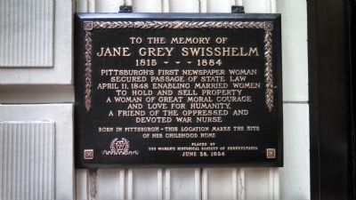 A marker commemorating Swisshelm’s childhood home is on the former Gimbel’s building next to the Duquesne Club, 325 Sixth Avenue
