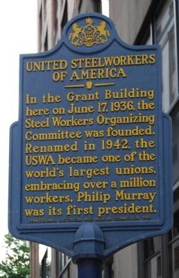 A marker for the Steel Workers Organizing Committee is beside the Grant Building, 4th Avenue near Grant Street